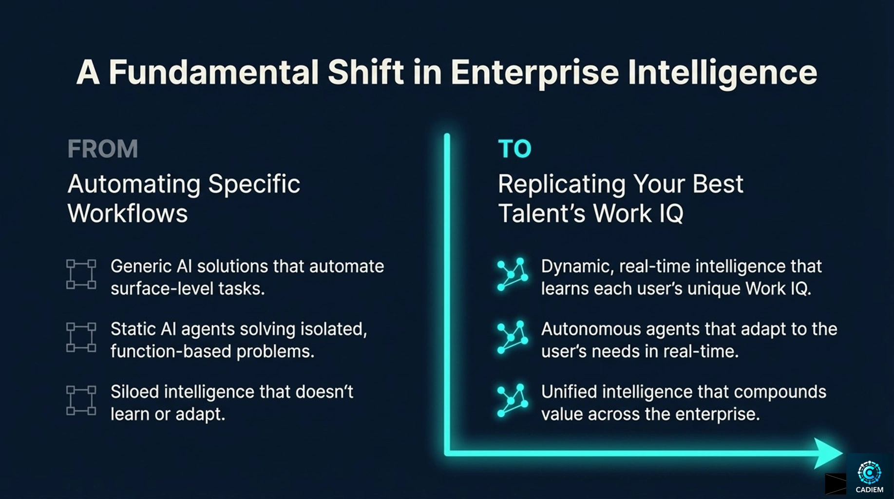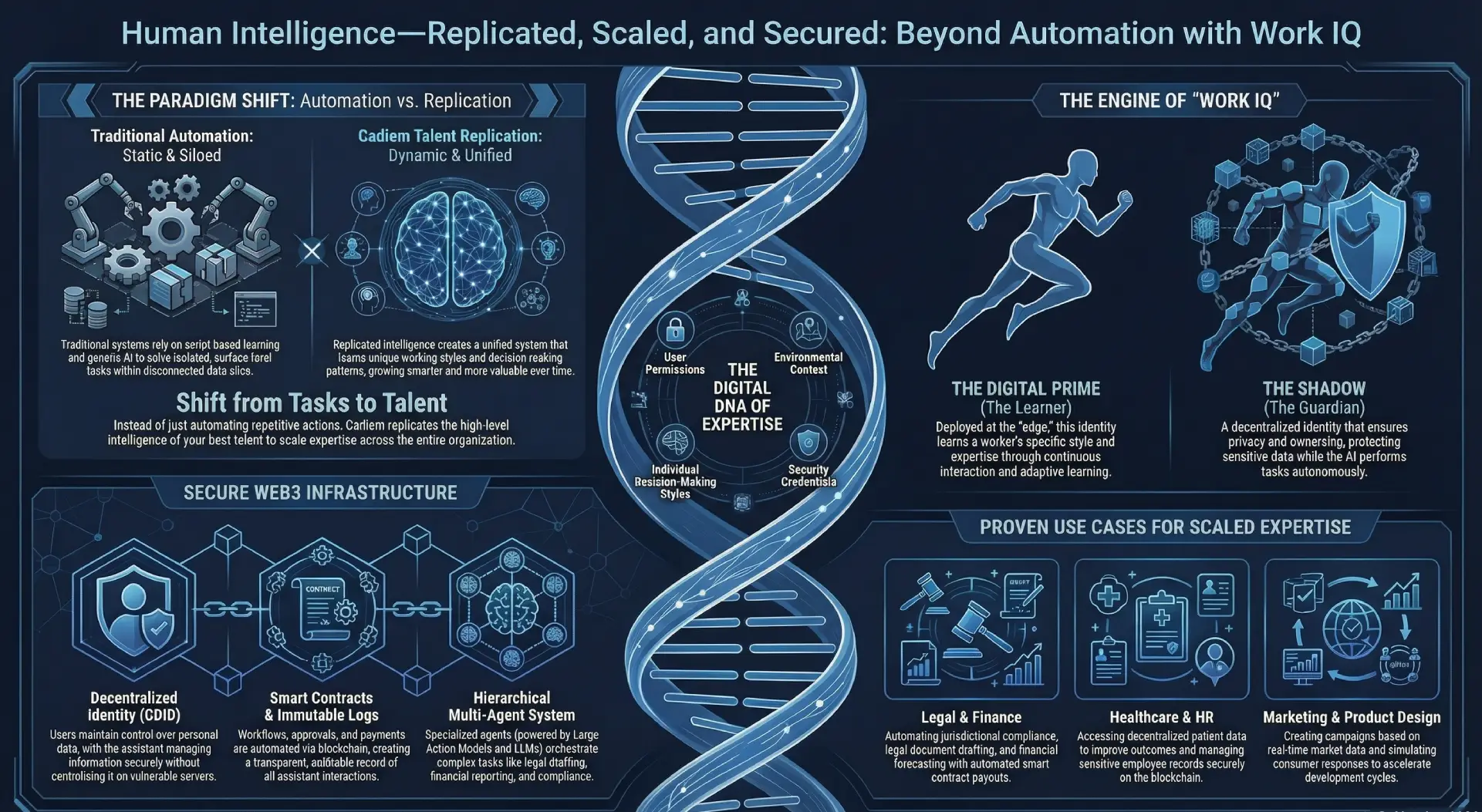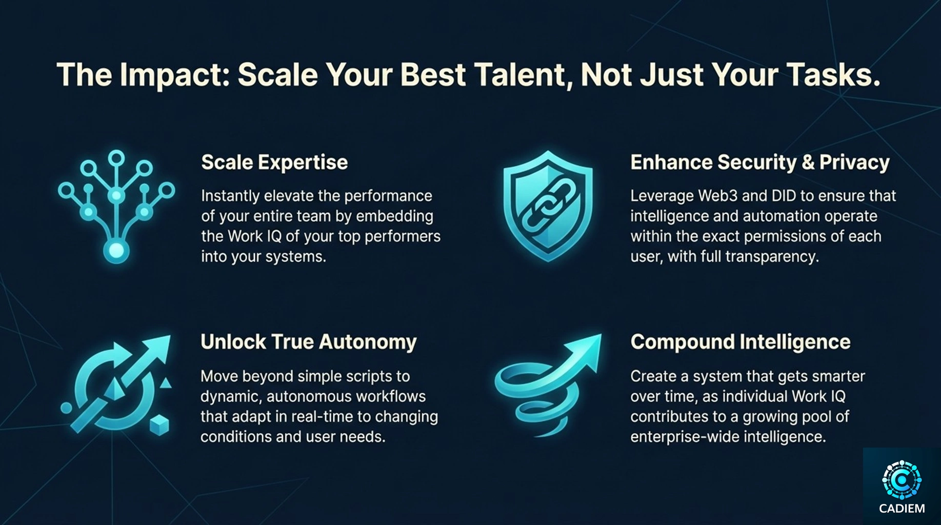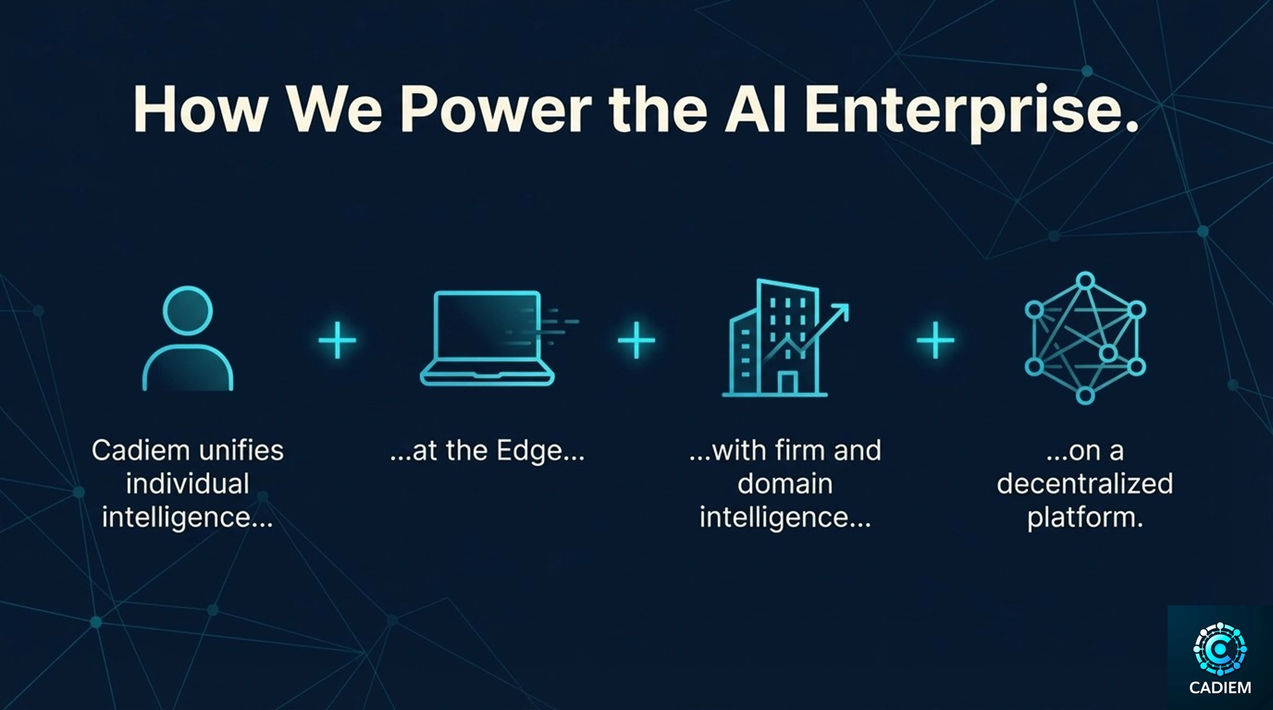 Cadiem unifies individual intelligence at the edge with enterprise-grade domain intelligence on a decentralized platform. This is the first architecture designed to scale the “mind” of the firm, not just its workflows.