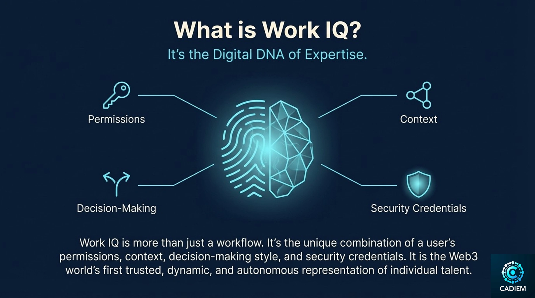 We define this breakthrough as Work IQ—the Web3 world’s first trusted, dynamic, and autonomous representation of individual talent. Unlike generic AI, Work IQ is a sovereign “Digital DNA” composed of four critical components: